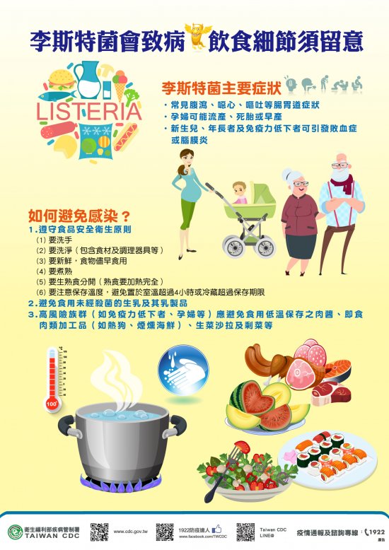 一 、近年國際間發生多起因食用遭李斯特菌污染的沙拉、即食肉品或哈密瓜等食品造成的大規模疫情,我國亦於107年起新增「李斯特菌症」為第四類法定傳染病。