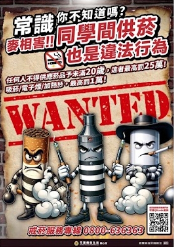 二、 為加強校園宣導任何人不得供菸予未滿20歲者及相關法 規,敬請透過貴單位網站、電子看板、Facebook、LINE 社 群網站等多元管道播放旨揭海報。